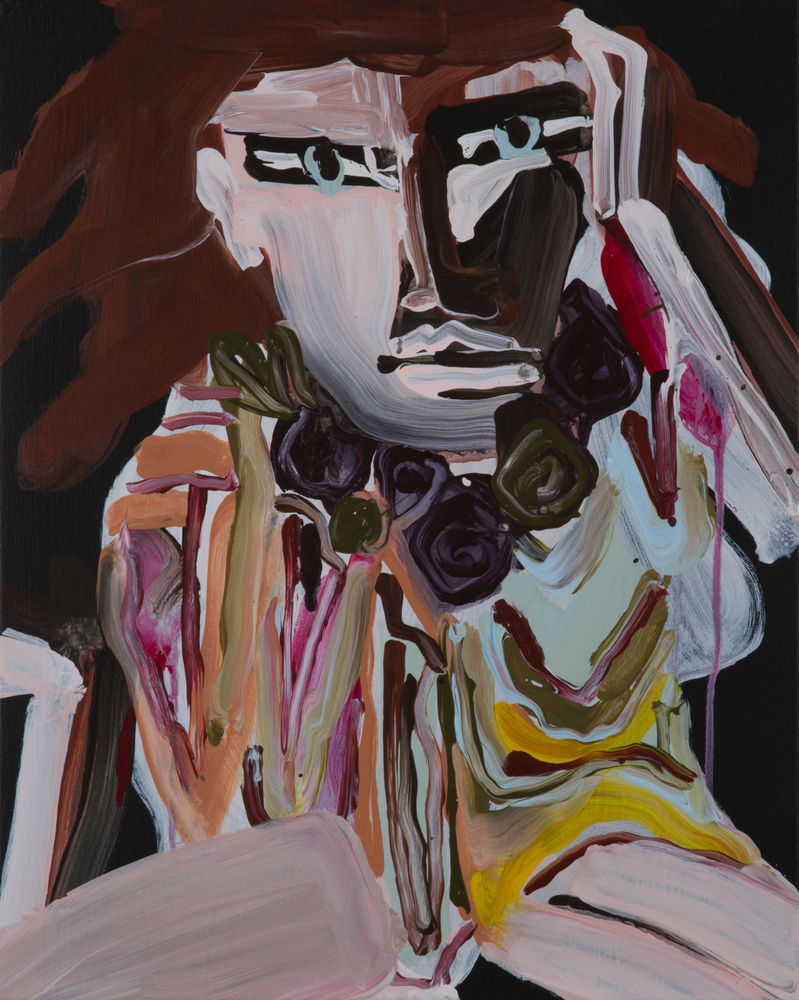 La obra de Katherine Bernhardt retrata a una mujer acariciando su pelo y utilizando un collar y prendas coloridas, quien parece tener las piernas abiertas. El fondo de la obra es negro.