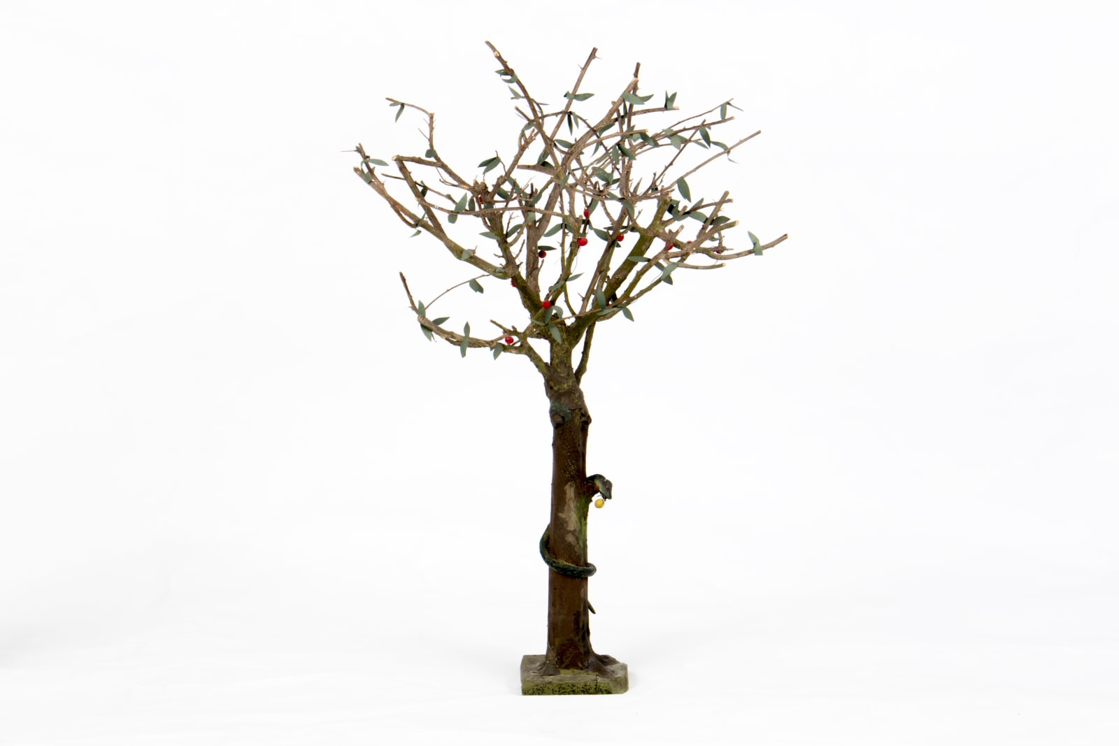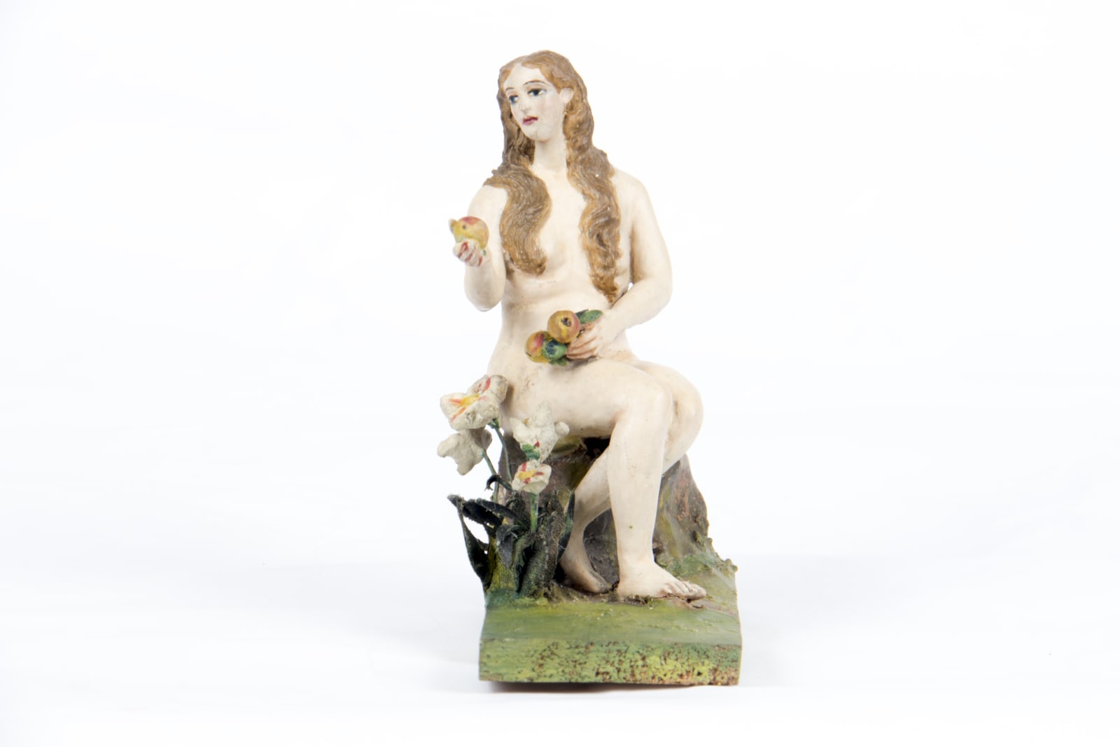 La escena describe la armonía que se vivía al momento de la Creación, en el lugar de los bienaventurados denominado Paraíso o Jardín del Edén. Eva y Adán convivieron ahí en paz hasta que una serpiente, símbolo de hostilidad, engaño y enemistad, les ofrece el fruto de la tentación, representado con una manzana del árbol al que Dios les había prohibido acercarse, y del que ellos finalmente comen. De este modo, se observa a la condición humana como una dimensión de fragilidad y susceptibilidad.