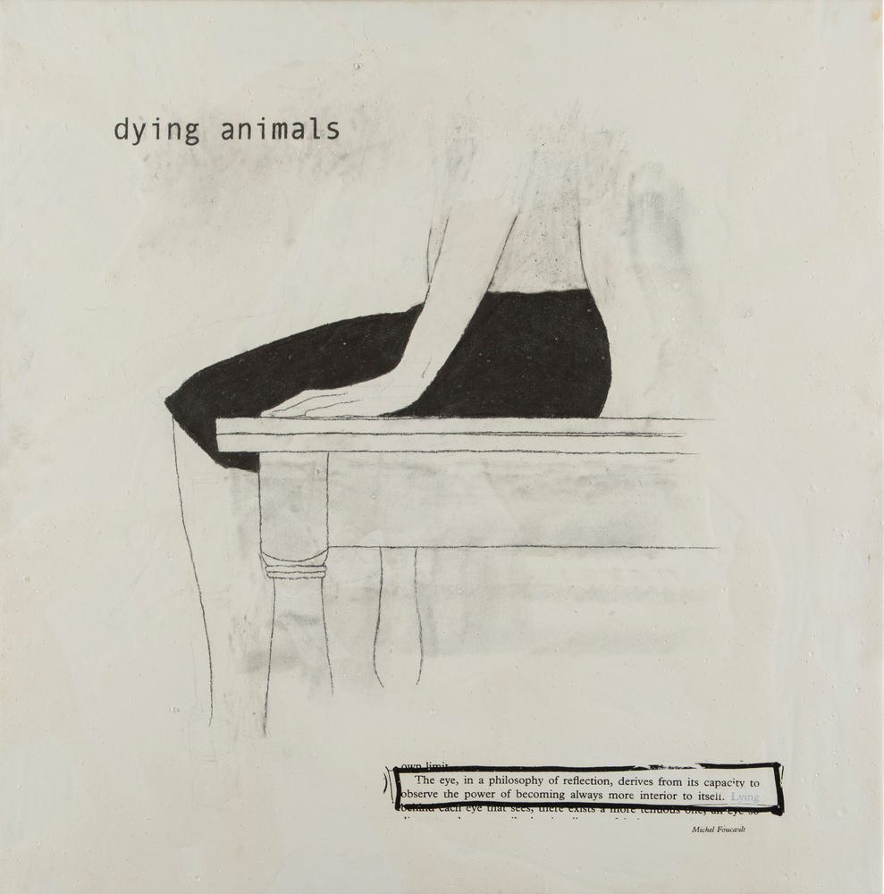 La obra de Julião Sarmento retrata la parte inferior del cuerpo de una mujer quien aparece sentada sobre una mesa utilizando una falda. Del lado inferior derecho se observa una frase de Michael Foucault enmarcada dentro de un rectángulo, y en la parte superior derecha aparece la frase "ying animals".