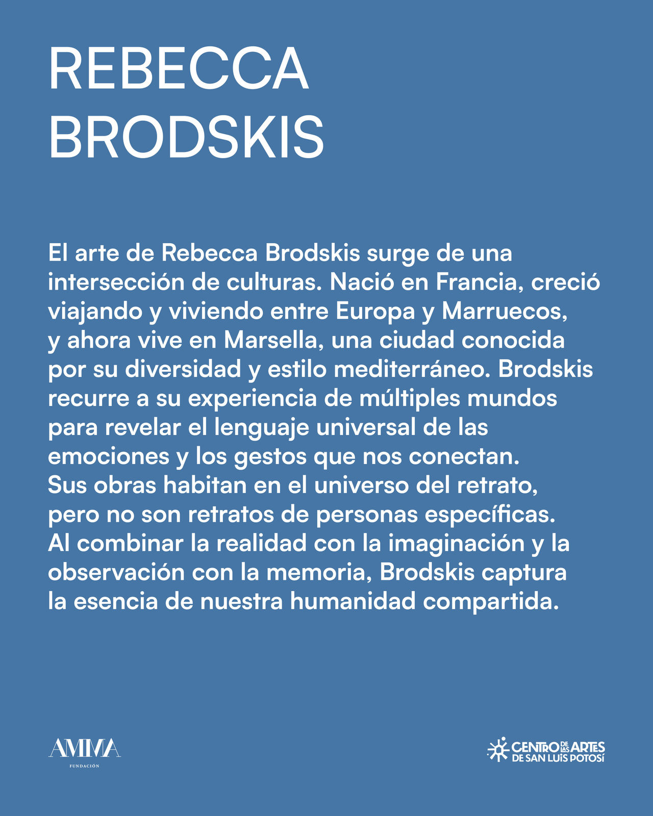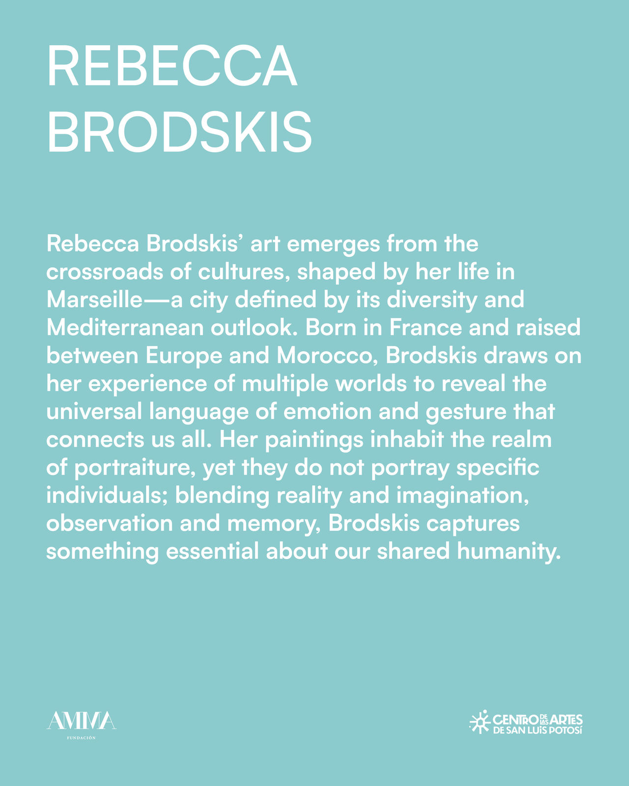 Fundación Amparo y Manuel presenta la primera exposición individual en México de la artista francesa-marroquí Rebecca Brodskis, artista cuya práctica se enmarca en el contexto contemporáneo europeo. Esta muestra busca replantear el retrato como un lenguaje universal del cuerpo y las emociones, nos desafía a mirar más allá de las apariencias y a conectar con la experiencia compartida de ser humanos. La obra de Brodskis tiene una mezcla de extrañeza y familiaridad y es un recordatorio contundente de la capacidad del arte para generar empatía, diálogo y comunidad en un mundo en constante cambio.
