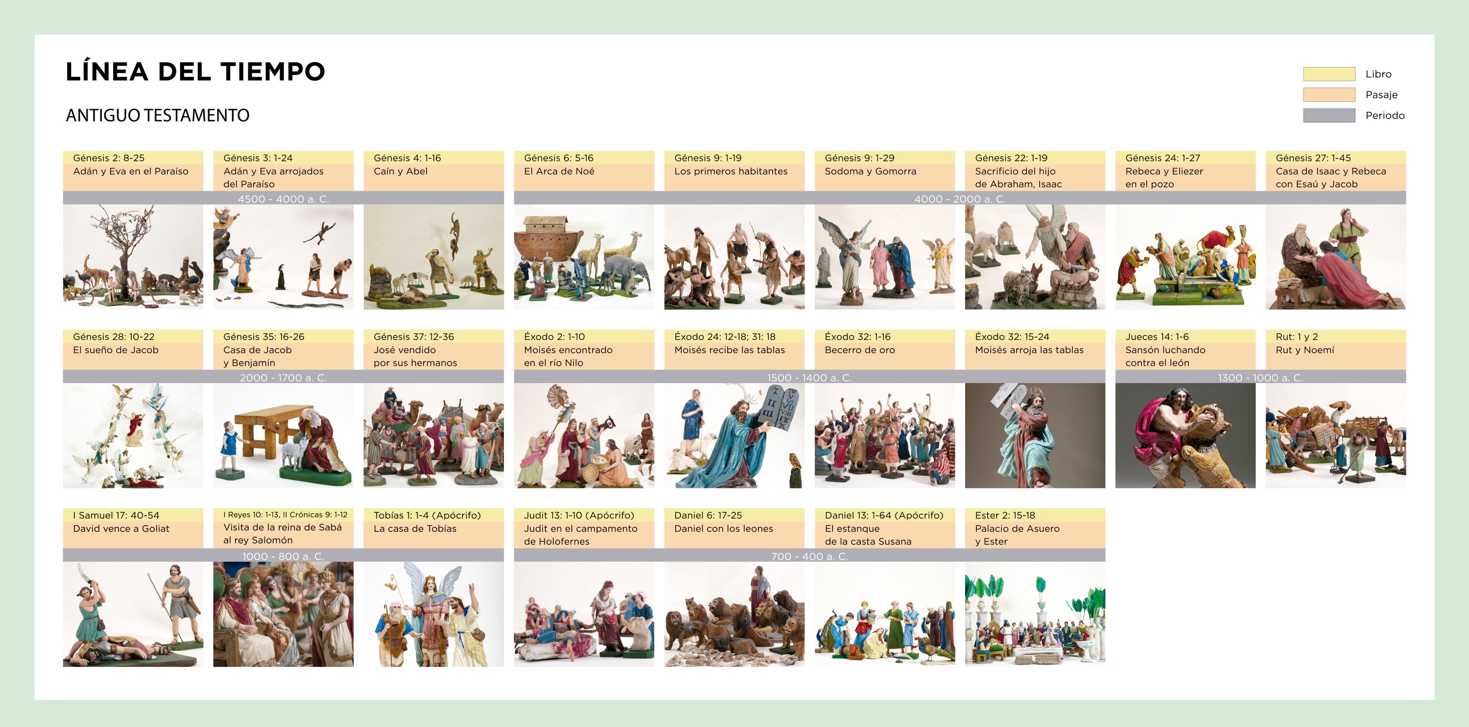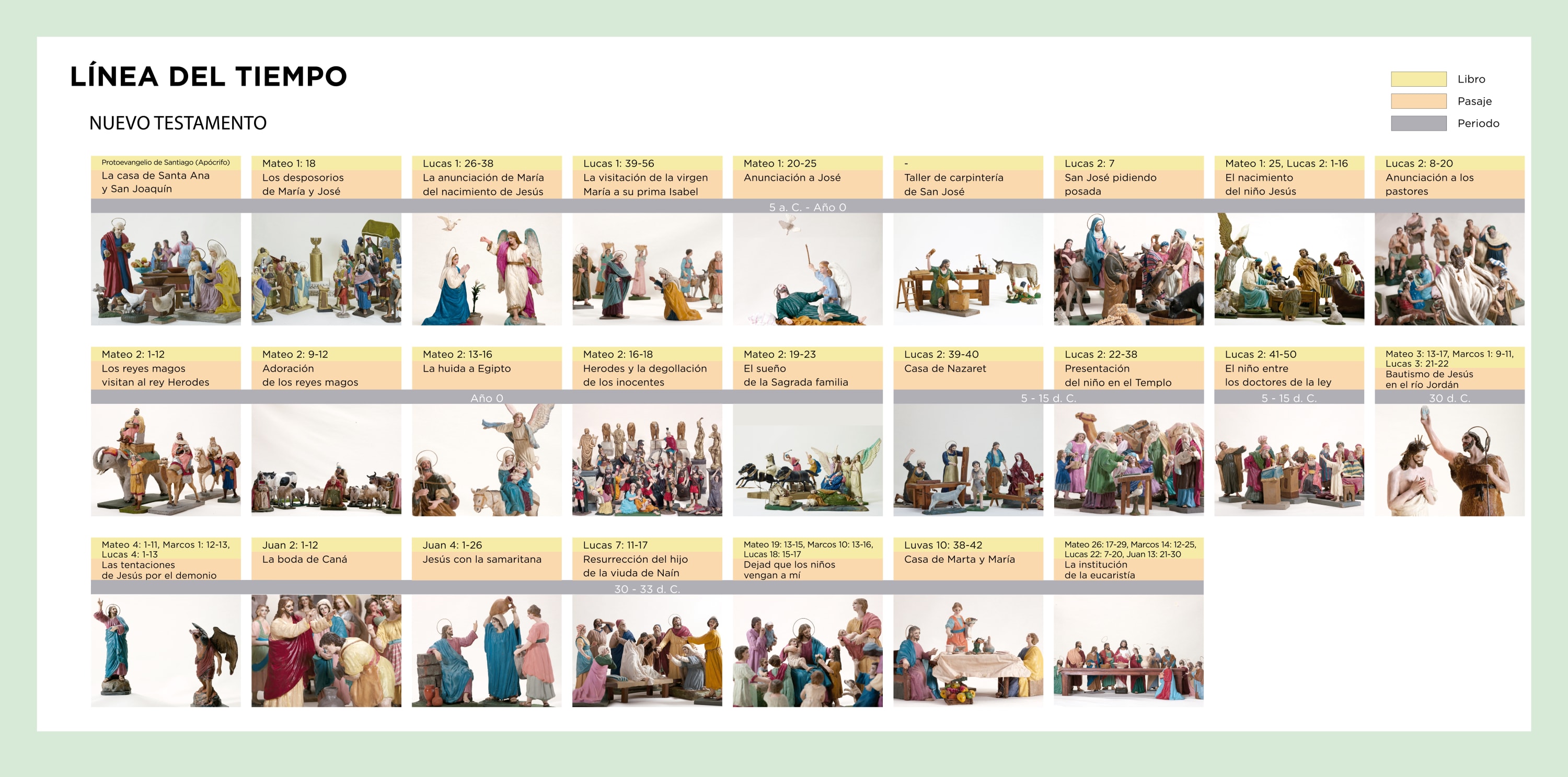 Uno de los libros más antiguos de la humanidad es la Biblia. Miles de años transcurren entre las historias ahí escritas. Colección de relatos que a través de la mirada religiosa e histórica, narran los tiempos de la creación del universo y la humanidad (Génesis), y describen lo que podría ser el fin del mundo (Apocalipsis). Para el cristianismo, el Antiguo y el Nuevo Testamento son las dos grandes secciones de la Biblia y se identifican porque el primero se desarrolla antes del nacimiento de Jesús en Belén; y el segundo porque cuenta los acontecimientos y la trayectoria del hijo de Dios en la Tierra. Hablar de una cronología exacta en los pasajes bíblicos es complejo. Se podría considerar que el año cero es justo cuando nace Jesús; sin embargo hay estudios que afirman que esta teoría es incierta. La exposición Nacimiento, Miradas en el tiempo tiene como eje principal la escena del Nacimiento de Jesús, que se contempla como un parteaguas entre el Antiguo y el Nuevo Testamento, comenzando éste último a partir de momentos de la vida de María y José en donde se vislumbra el advenimiento de Jesús.